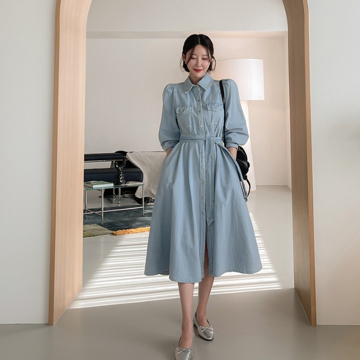 Bên cạnh váy sơ mi màu trung tính như đen, ghi xám, be…, các nàng hãy làm mới style với váy sơ mi denim. Mẫu váy này tươi trẻ và nổi bật nhưng vẫn phù hợp với phong cách tối giản. Lưu ý rằng khi diện váy sơ mi, chị em nên tô điểm một đường nhấn eo để tôn dáng cao ráo, thon gọn và ghi điểm chỉn chu.
