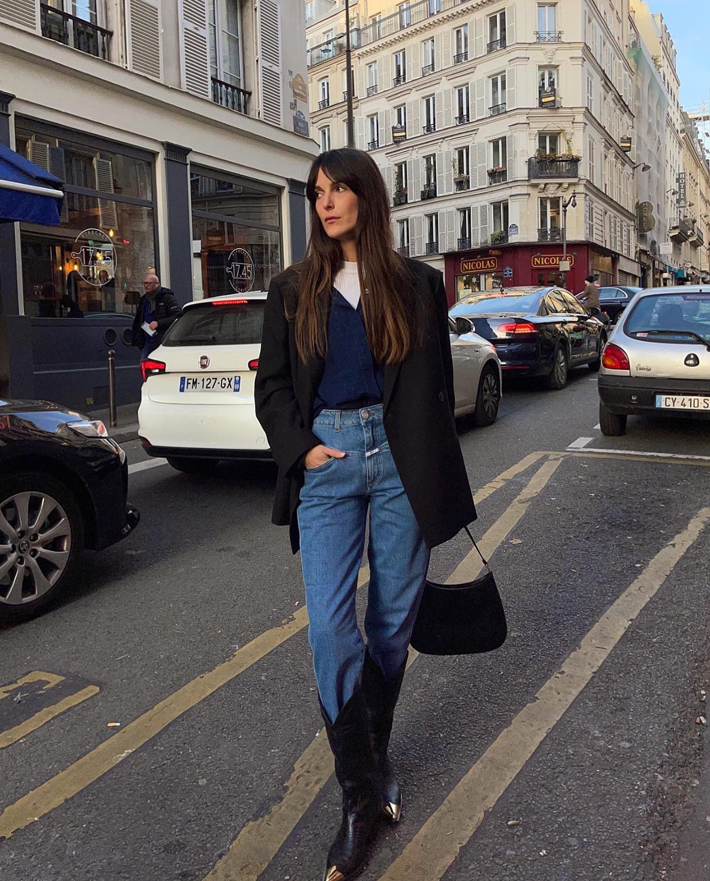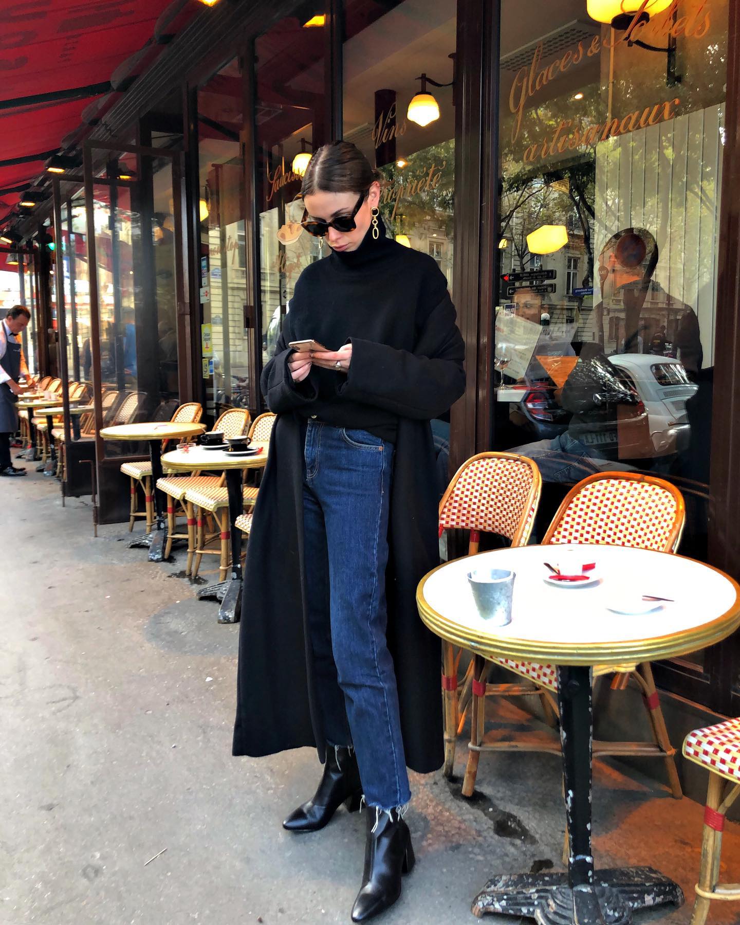 Áo khoác blazer màu đen phủ sóng phong cách mùa lạnh của các quý cô người Pháp. Họ kết hợp mẫu áo khoác này với những kiểu áo màu trung tính và quần jeans/quần âu để hoàn thiện outfit thời thượng, giúp ghi điểm sành điệu từ công sở ra phố.