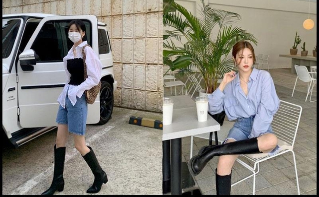 Công thức diện sơ mi đẹp chuẩn như gái Hàn bao gồm sơ mi, quần shorts và boots cao.