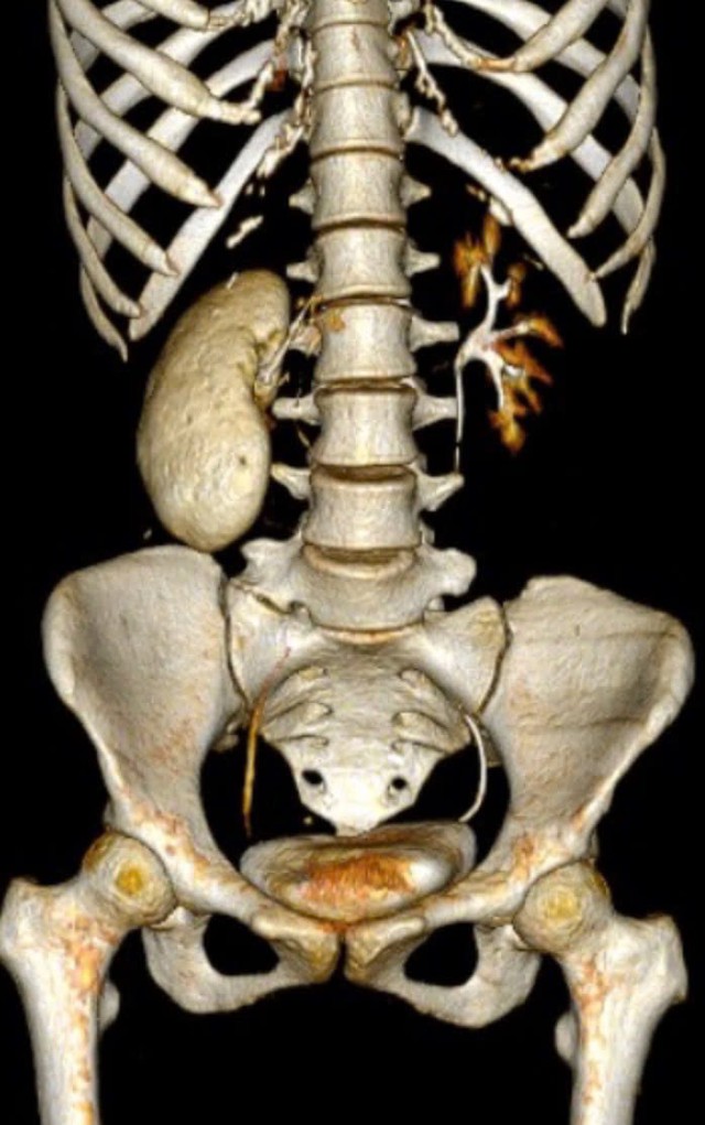 Tại bệnh viện, qua thăm khám, các bác sĩ nhận thấy bệnh nhân bị viêm thận, sỏi niệu quản 4mm gây tắc nghẽn đột ngột. Đáng chú ý, hình ảnh chụp CT cho thấy thận của bệnh nhân bị viêm hóa đá (vì nước tiểu tắc nghẽn; viêm thận).