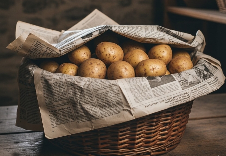 Để hạn chế độ ẩm, hãy lót giấy báo dưới đáy một thùng carton, rải khoai lên từng lớp xen kẽ với một ít baking soda. (Ảnh minh hoạ)