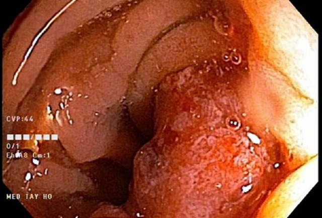 – K đại tràng sigma: Nội soi đại tràng tại đại tràng sigma có tổn thương sùi nham nhở, mủn nát, chạm vào dễ chảy máu, kích thước khoảng 4-5cm, chiếm khoảng 1/3 chu vi đại tràng. Ngay trong quá trình nội soi phát hiện bất thường, các bác sĩ tiến hành lấy sinh thiết 4 mảnh làm mô bệnh học. Kết quả giải phẫu bệnh: Carcinoma tuyến biệt hóa vừa nên chuẩn đoán ung thư đại tràng.