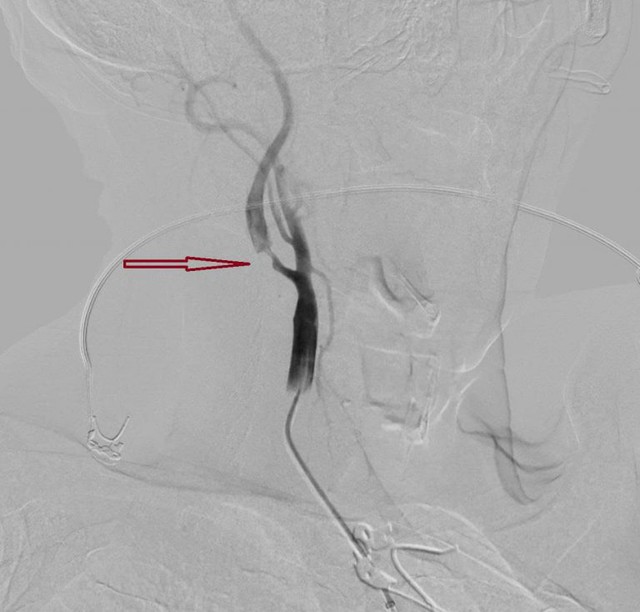 Hình DSA cho thấy hẹp nặng đoạn gốc động mạch cảnh trong ngoài sọ trước can thiệp của bệnh nhân đột quỵ. Ảnh: BVCC