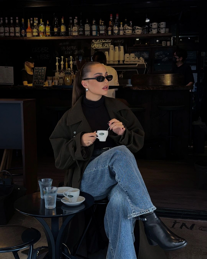 Sự kết hợp của áo khoác dạ với quần jeans mang vẻ đẹp thanh lịch vượt thời gian.