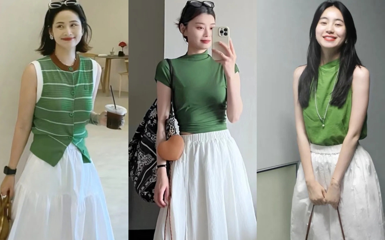 Phối váy trắng cùng áo vàng hoặc xanh lá: Trẻ trung, tươi mới